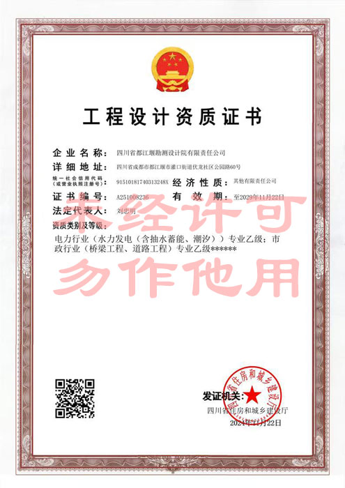 四川省都江堰勘測設計院有限責任公司是一家專業(yè)從事水利水電工程勘察設計的專業(yè)甲級設計院,目前具有水利行業(yè)(灌溉排澇)專業(yè)甲級、水利行業(yè)(引調水、河道整治、城市防洪)專業(yè)乙級、電力行業(yè)(水力發(fā)電(含抽水蓄能、潮汐))專業(yè)乙級、市政行業(yè)(道路工程、橋梁工程)專業(yè)乙級、水利行業(yè)(水庫樞紐、圍墾、水土保持)專業(yè)丙級設計資質、工程勘察專業(yè)類(巖土工程、水文地質、工程測量)乙級資質和水利工程咨詢、項目管理丙級資質,通過了ISO9001:2008質量體系國際標準認證。